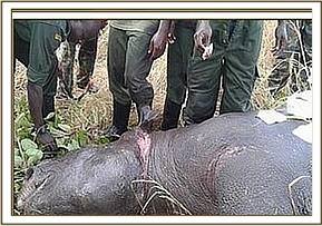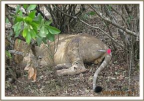 This bull was alone in a relatively open area. He appeared to be in great pain and reluctant to move. A relatively fresh wound with bloody discharge was visible on his left flank. The urine he released at the time of observation appeared to be blood tinged. A decision to immobilize him for further examination was arrived at.