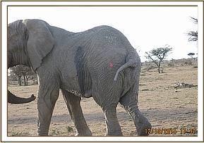 This big bull in Mara Triangle Conservancy was seen close to the snared giraffe. His left forelimb had a fresh wound to one of the inner toes caused by loss of the nail. Further examination revealed this elephant had been treated a couple of months ago for a snare that was tight around this limb. The limb had since healed and the fresh wound was thought to have been caused by accidental knock on a rock or tree stump. He was in good condition and showed no signs of lameness or pain. There was a small wound which should heal without intervention. However the rangers were advised to monitor this elephant and report back if it gets worse.