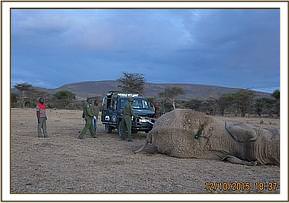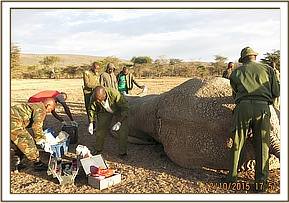 This massive bull was seen by KWS security team together with Olkinyei Conservancy staff hardly mobile with blood tinged exudate from a wound to his left flank. They called the Mobile veterinary unit for assessment and way forward.