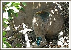He was chemically immobilized by use of a combination of 4mgs Medetomidine and 260mgs Ketamine delivered through a 3ml Dan inject dart from a vehicle. It took ten minutes for him to be fully anaesthetized. A blind fold was used to cover his eyes and Cloxacillin eye ointment applied to prevent desiccation.