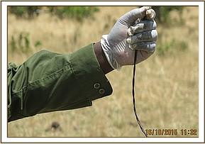 Immobilization was achieved by use of 3mgs Etorphine hydrochloride delivered through a 1.5ml dan-inject dart from foot. Both the mother and the calf were pushed out of the Lugga into the open. As soon as the calf succumbed to the drug the mother was moved away by vehicles while the vet team concentrated on removing the snare. It was a braided cable wire which had caused mild abrasion wounds to the neck which were cleaned and disinfected with iodine. He also received 3000mgs intramuscular injection of amoxicillin antibiotic.