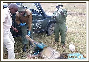 This massive bull was seen with spear wound to the left side of his flank discharging purulent stuff by County Government staff and visiting tourists. They called the unit for intervention.