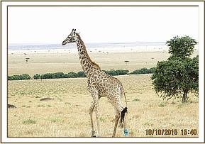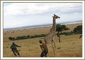 This young giraffe was seen with a snare around the leg on the extreme western border of Mara Triangle Conservancy near the escarpment and reported to the Vet Unit by Conservancy management. The Unit found this giraffe in a small herd limping on her left hind limb with a snare around her distal metacarpus. Her condition was still good and she could be seen browsing.