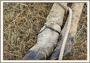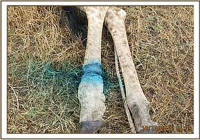 The Vet Unit found Blackie alone near a Lugga lying down and in a lot of pain. His hindquarters bore multiple bite wounds with blood stains. The right hind limb appeared to be severely injured and not weight bearing.