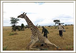 Immobilization was achieved by use of a combination of 8mgs Etorphine hydrochloride and 50mgs Azaperone delivered in a 1.5ml dan-inject dart from a vehicle. It took seven minutes for the drugs to take full effect with the giraffe assuming right lateral recumbency.