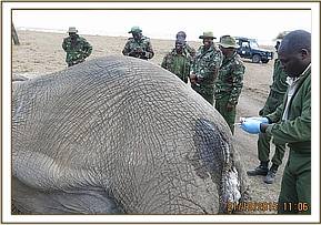 The Unit found the elephant in the open near a waterpoint in the company of an equally massive bull just a few meters away. He appeared to be in great pain and reluctant to move. The wound was visible from a distance.