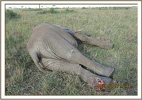 This old elephant nursing a 3-year-old calf was being monitored, following deterioration in her body condition despite treatment. She had been treated a month ago for a small arrow wound with possible low-grade peritonitis. During the treatment, her body condition was poor with visible debilitation and worn out molars impending negatively on her ability to browse. She seemed to show some slight improvement but not satisfactorily. It is reported she slipped into a muddy pool and could not help herself out.