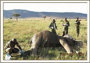 Mara Elephant Project team noted an immobility alert signal from her collar and got concerned and on responding, they found her lying on her right lateral side with signs of posterior paralysis. There was a fresh bleeding wound on her spine at the withers. From their records, she had been lying there for at least 24hours immobile. They called the veterinary unit for assessment.