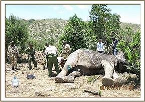 He was pushed from the thicket to an open place by rangers on foot. Restraint was achieved chemically by use of a combination of 5mgs etorphine hydrochloride and 50mgs azaperone delivered through a 1.5mldaninject dart from a vehicle.He was recumbent in seven minutes upon where examination and treatment was conducted. He had a plain wire round his fetlock joint of front left limb. This snare had caused some wounds through abrasion. It appeared to have been in place for approximately one week.