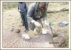 Immobilization was achieved by use of a combination of 13mgs etorphine hydrochloride and 60mgs azaperone delivered through a 3mldaninject dart from a vehicle. It took eight minutes for the drugs to take effect upon where he was roped down for treatment. Once down he was reversed with 36mgs diprenorphine hydrochloride through jugular vein, but the neck and head pinned down to continue with treatment. The arrow was gently removed and on examination, it was barbed but not poisoned.