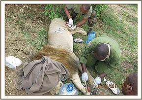 This lion additionally received intramuscular injection of amoxicillin antibiotic and subcutaneous administration of ivermectin parasiticide.