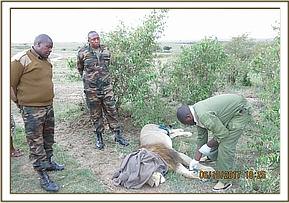 Restraint was achieved chemically by use of a combination of 240mgs ketamine and 6mgs medetomidine hydrochloride delivered through a 3mldaninject dart. Darting was done from a vehicle. Examination was done fifteen minutes after darting when he was under full effects of the anaesthetics.
