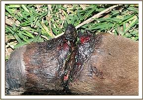This was a case of an adult female elephant in a herd of six other elephants; it had a deep wound penetrating through the right thigh muscles. The wound was already infected, exuding some pus and with pieces of necrotic tissues falling off from the wound. It was suspected that the elephant was attacked with an arrow and later on an inflammation and infection set in.