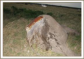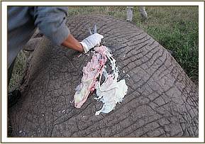 The elephant was darted from a vehicle using 17mgs of etorphine Hcl combined with 1500 i.u of hyaluronidase, the drug took effect after about 7 minutes and it became recumbent. The wound was examined and probed using a long tissue forceps and swabs.
