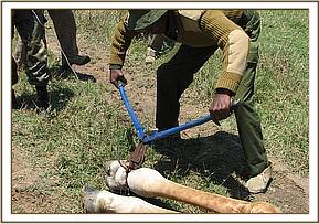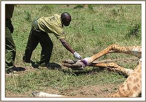 An adult male giraffe was sighted near Main Governors lodge in Maasai Mara with a tight wire snare cutting through the tarso-metatarsal joint of the left front leg. It was found a lone under a tree, it was under intensive pain and not able to move freely with the rest of the herd. Chemical immobilization and restraint The giraffe was captured by darting using 12mgs of etorphine hydrochloride combined with 30mgs of xylazine hydrochloride, darted on the left thigh. The drug took effect after about 10 minutes and the animal was physically roped down.
