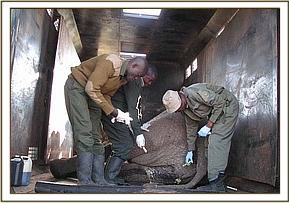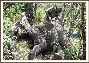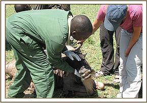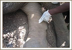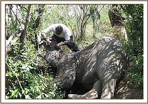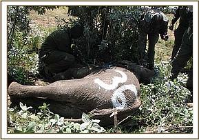 Summary During the month of September, 2012, the Mara veterinary unit was involved in a number of activities including treatment of an elephant in Mara conservancy and translocation of elephants from Siyapei area in Narok to Masai Mara to reduce incidences of human-elephant conflicts. The unit also conducted an active surveillance and epidemiological survey of malignant catarrhal fever (MCF) disease in wildebeest of Masai Mara ecosystem, this was a collaborative effort between KWS, DSWT and University of Nairobi, a total of 21 wildebeests were captured and sampled. All the veterinary activities went on successfully during the month as reported below. Treatment of a wounded sub-adult male elephant in Mara Conservancy. This was a case of a sub-adult male elephant which had a penetrative wound on the medial side of right hind leg. The elephant was under great pain and could only walk slowly, it had been left alone in the thicket. The cause of the injury was not known but it was suspected that the animal could have been shot by an arrow-head during an incident of human-elephant conflict. The elephant was sighted by the rangers of Mara conservancy who immediately informed the vet to attend to it. Chemical immobilization, examination and treatment The elephant was darted from the ground using 10mgs of etorphine Hcl combined with 1500 i.u on the right thigh. The drug took effect after about 5 minutes and it became recumbent. The wound was then examined for the presence of any foreign material but there was none, the affected limb was extensively swollen and oedematous. An opening was created to drain all the accumulated fluid and pus from the injury. The wound was also cleaned and debrided using 10% hydrogen peroxide draining all the accumulated pus and then treated using a topical application of a tincture of iodine and oxytetracycline spray. Further treatments by intramuscular administration of long-acting Amoxycillin (Betamox) antibiotics and flunixin meglumine were also provided.
