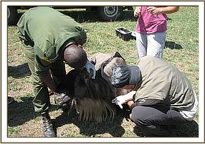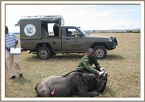 Twenty one (21) wildebeests were captured by darting from a vehicle using 3 - 5mgs of etorphine hydrochloride combined with 30mgs of xylazine hydrochloride depending on age and size. Blood, ticks and tissue samples were collected from each animal and will be analyzed for MCF disease.