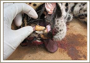 Major findings were deep canine marks penetrating the skull into subdura causing damage to the brain. The bites were inflicted by a large carnivore suspected to be a lion. This caused crushing of the skull with resultant bleeding from the nose and mouth. The leopard died instantly.