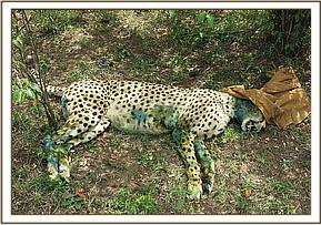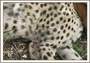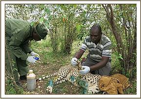 The affected areas were scrapped to remove debris, disinfected with lugol’s Iodine before tetracycline spray being applied. The cheetah was given 750mgs Amoxicillin Antibiotic and 10mgs Dexamethasone Sodium anti-inflammatory intramuscularly. In addition 30mgs Ivermectin was given subcutaneously to get rid of mange and other internal and external parasites.