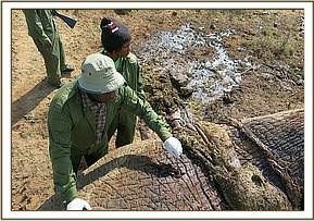 She was chemically immobilized by use of a combination of 2mgs Etorphine Hydrochloride and 20mgs Azaperone in a 2ml Daninject dart by vehicle. The drugs took effect after 3minutes. A Blind fold was put in place before the examination was conducted.