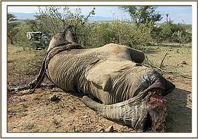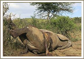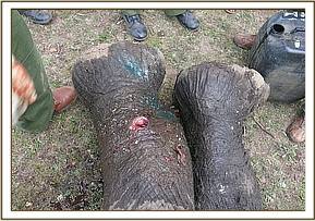 - The carcass was lying on his left lateral with both tusks intact.