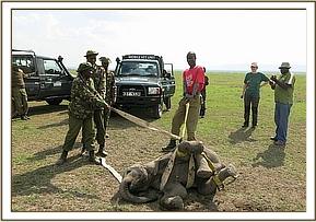 This baby elephant was under protection of an older brother who was scared away by use of vehicles to join another herd. He was manually restrained with help of ropes and 25mgs of Azaperone given intramuscularly to calm him. He was then transported to Musiara airstrip to be taken to David Sheldrick Orphanage in Nairobi. Just before being put on plane, another dose of 25mgs Azaperone was administered. All vital parameters of this baby elephant were within range.