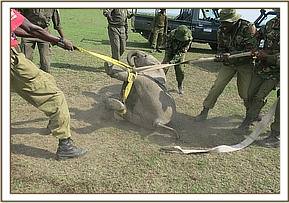 Immobilization was achieved chemically by use of combination of 1.3mgs Medetomidine and 130mgs Ketamine delivered through a 3ml Daninject dart. Darting was by vehicle. The drugs took full effect after ten minutes.