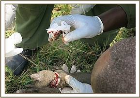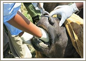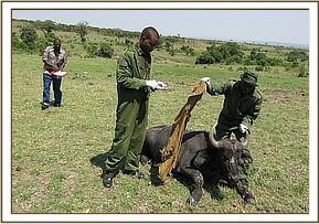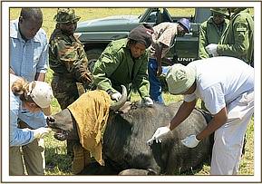 This one week exercise was conducted in conjunction with a team from KWS headquarters (veterinary department) together with a team from Ministry of Agriculture, Livestock and Fisheries (Foot and Mouth Disease Laboratories, Embakasi).This sampling aims to establish the Foot and Mouth Disease virus Serotypes existing in the buffaloes and compare with the ones circulating in the domestic animals. This is the second phase of investigation after the first one having been carried out in 2012.The results of this investigation will help advice management of both sectors on best control strategies of this notifiable disease. Samples collected will also reveal whether there are other parasites being haboured by buffaloes and the best way to control them. During the exercise, a total of 34 buffaloes were sampled.