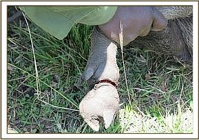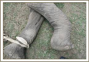 This elephant appeared to be in good body condition though limping on his right forelimb. The carpal joint looked abit swollen but with no obvious wound. The elephant could still put on weight on this limb. A decision to immobilize this elephant for closer examination was arrived at.