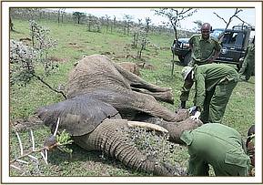 This elephant died as a result of Acute Chemical and Septic Peritonitis occasioned by resultant rupture of bowels through spearing. The chemical and microbial contents of the Gastrointestinal system contaminated the Peritoneum. The spear too could have been laced with poison. Due to the size of the tusks, the elephant could have been a target of poachers. Both tusks were recovered and taken for accountability and safe custody by KWS security team that was around.