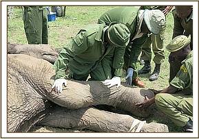 This was achieved by administration of 48mgs Diprenorphine Hydrochloride through the ear vein. The elephant woke up after two minutes and walked away.