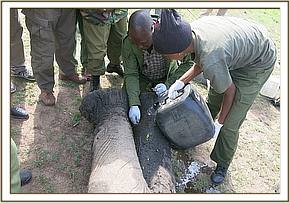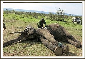It appears that due to his slow movement because of the previous injury, this elephant was an easier target for poachers who tried to kill him with poisoned arrows. The KWS security team and the Mara elephant project rangers present at the time of treatment were advised to keep vigil and monitor this elephant with big tusks that appears to be targeted by poachers.