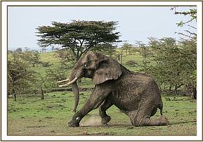 Immobilization was achieved by delivery of 14mgs Etorphine Hydrochloride remotely through a 3ml Daninject dart. Darting was by vehicle. The drugs took effect after 8minutes with elephant assuming right lateral recumbency. After examining the inner surface of the right carpus which had no injury, the elephant was flipped over to examine the lateral surface. No wound was evident though the joint was moderately swollen and stiff. This appeared to be a long standing sprain with resultant flexion of the joint. The joint had become stiff with limited mobility. Aspiration of the joint yielded nothing unusual.