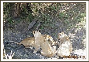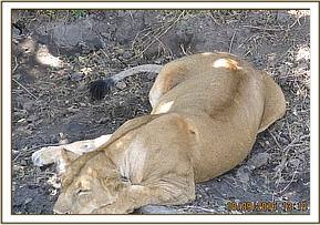 She was seen near a small river under a shade with the other female pride members. The males were a few meters away. She had visible injuries to the hind legs and a small swelling on the belly, specifically at the umbilicus.