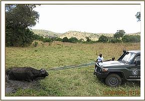 He was eventually roped and pulled out of the mud and after resting for few minutes, he got up and began grazing.