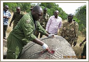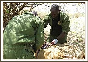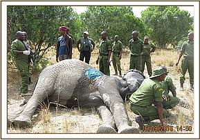 Immobilization was achieved by use of 15mgs Etorphine hydrochloride delivered through a 3ml dan-inject dart from a helicopter. She was then guided out of a thicket to open ground for easy access for treatment. Drug induction time was 10 minutes and she assumed right lateral recumbency. She had to be flipped over for the attending team to access the injury.