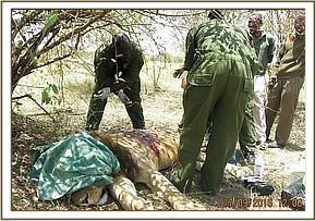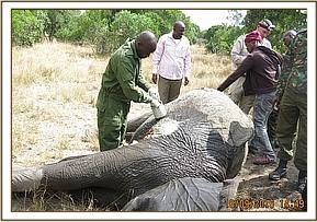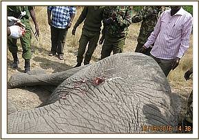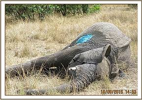 This baby elephant was in good body condition though still suckling. She lay on her side with multiple deep spear wounds evident in most parts of her body.