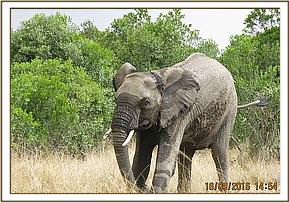 This old male is a member of a bachelor herd consisting of four old males that have stayed around the research station for a couple of years now. He was found in the mid-morning of this date struggling to get out of a small muddy pool he had wallowed in. After several attempts, he became fatigued and could not get himself out of the mud.