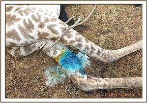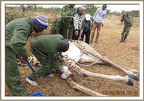 Immobilization was achieved by use of combination of 12mgs Etorphine hydrochloride and 60mgs Azaperone delivered in a 3ml dan-inject dart from a vehicle. It took eight minutes for the drugs to take full effect and this giraffe assisted to the ground with the help of ropes.