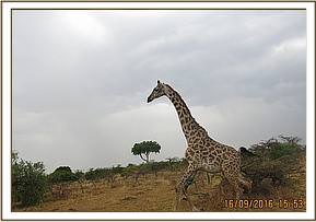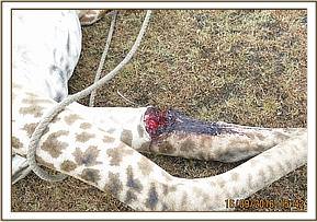This giraffe was spotted by the Conservancy Rangers as they were checking on the injured elephant. She was treated soon after the elephant case was handled. This giraffe was in company of ten giraffes browsing within the Conservancy. She was limping on her left front leg. A wire snare was visibly tight round her left front limb between the shoulder and knee.