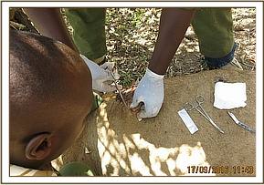 Examination revealed a tight plain wire snare which had eaten into the muscular tissues of the leg. The wire was removed leaving an open wound. This wound had been infested with maggots and appeared septic. All the maggots were removed manually and necrotic tissue debrided with the help of Hydrogen peroxide. Copious amount of water was used to rinse this wound before tincture of iodine was applied. Green clay was then packed into the wound to promote quick healing.