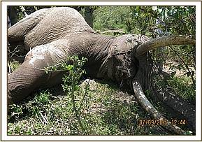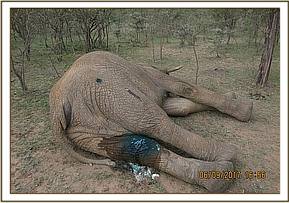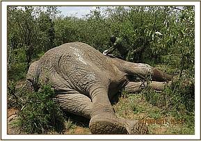 Restraint was achieved by use of 17mgs etorphine hydrochloride delivered in a 3mldaninject dart from a vehicle. It took ten minutes for this elephant to be fully narcotized. He assumed left lateral recumbency at the edge of a bush.