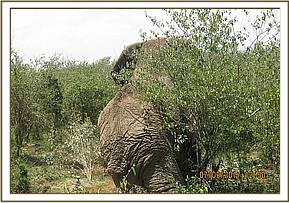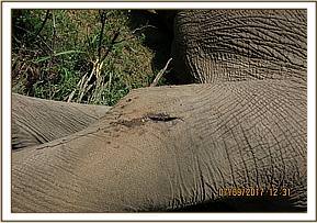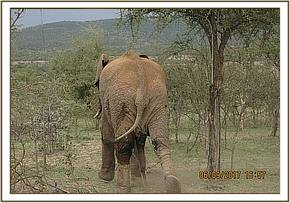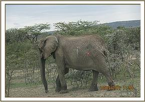 This bull was seen browsing with a big herd within the conservancy. He was in good body condition though with a small swelling on the inner side of his left thigh.