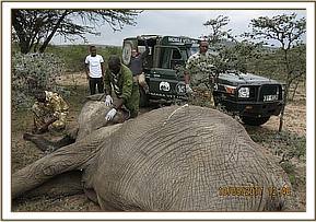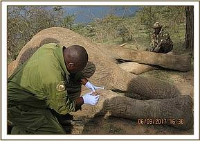 She was restrained chemically by use of a combination of 4.8mgs medetomidine and 230mgs ketamine delivered through a 3mldaninject dart from a vehicle. She got fully anaesthetized after ten minutes whereupon a blindfold and eye ointment was put in place.