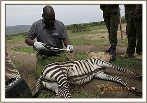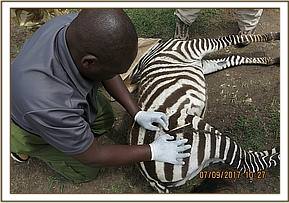 This zebra foal was seen with an arrow lodged on her right rump by warden in charge of Olalaimutiak sector within Masai Mara National Reserve. He sought our services to intervene.