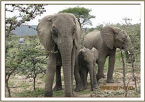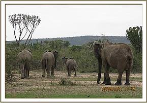 This old female with her three calves was seen in poor condition with an old discharging wound on her left flank.