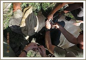 Restraint was achieved chemically by use of 13mgs etorphine hydrochloride, this being approximately ¾ of dose for an adult female owing to her condition. However, she could not be fully narcotized with this dose as she stood still partially anaesthetized. Additional 3mgs etorphine was given remotely through darting. It took another two minutes for the drugs to take full effect and she assumed right lateral recumbency.