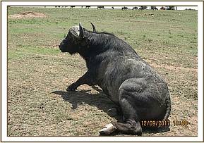 This buffalo was seen by the edge of a small thicket with his mates with a plastic pipe round his left hind leg. He stood up but moved with pain.