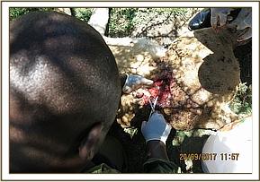 Examination revealed a fresh spear wound on the lateral side of his right front leg likely caused by a spear. Probing of the wound yielded no foreign body but muscles around this area were partially split.