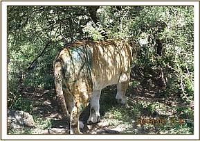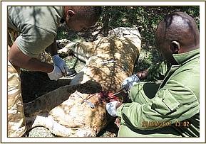 Examination revealed a big wound splitting some flank muscles on her right flank and bite wounds on her left flank towards her back. All the wounds appeared fresh with the right one thought to have been caused by a buffalo gore. A number of hyenas were seen trailing this lioness and may have tried to attack her after the buffalo injury causing the multiple bites on her left backside.